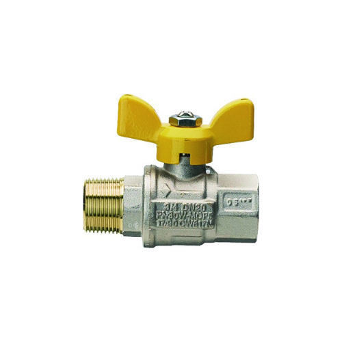 Mosazný poniklovaný kulový kohout s plným průtokem a ocelovým motýlem. Závity vnější/vnitřní dle ISO 7.1 R x Rp. Těsnění hřídele 2 x PTFE (teflon) a 1 x ,,O" kroužek NBR. Pracovní teplota -20 až 90 °C. Teflonová ucpávka je oproti neznačkovým kulovým kohoutům namontována spolu s hřídelkou zevnitř kulového kohoutu viz. detail zde. Kulový kohout je určený pro plynná paliva 1., 2., a 3. třídy (zemní plyn, směs propan-butan, svítiplyn). Tlaková třída MO5, pracovní přetlak: 0,001 MPa až 0,5 MPa.