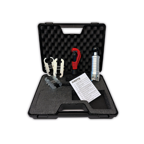 Kufor obsahuje 3 držiaky 3/8" - 5/4" pre vodu a plyn (43393, 43392 a 43535), inovovaný rezák s vodiacimi valčekmi pre rúrky 4-82 mm (43455) a ručný lis 60DB pre lisovanie rúrok2 Eurotis..